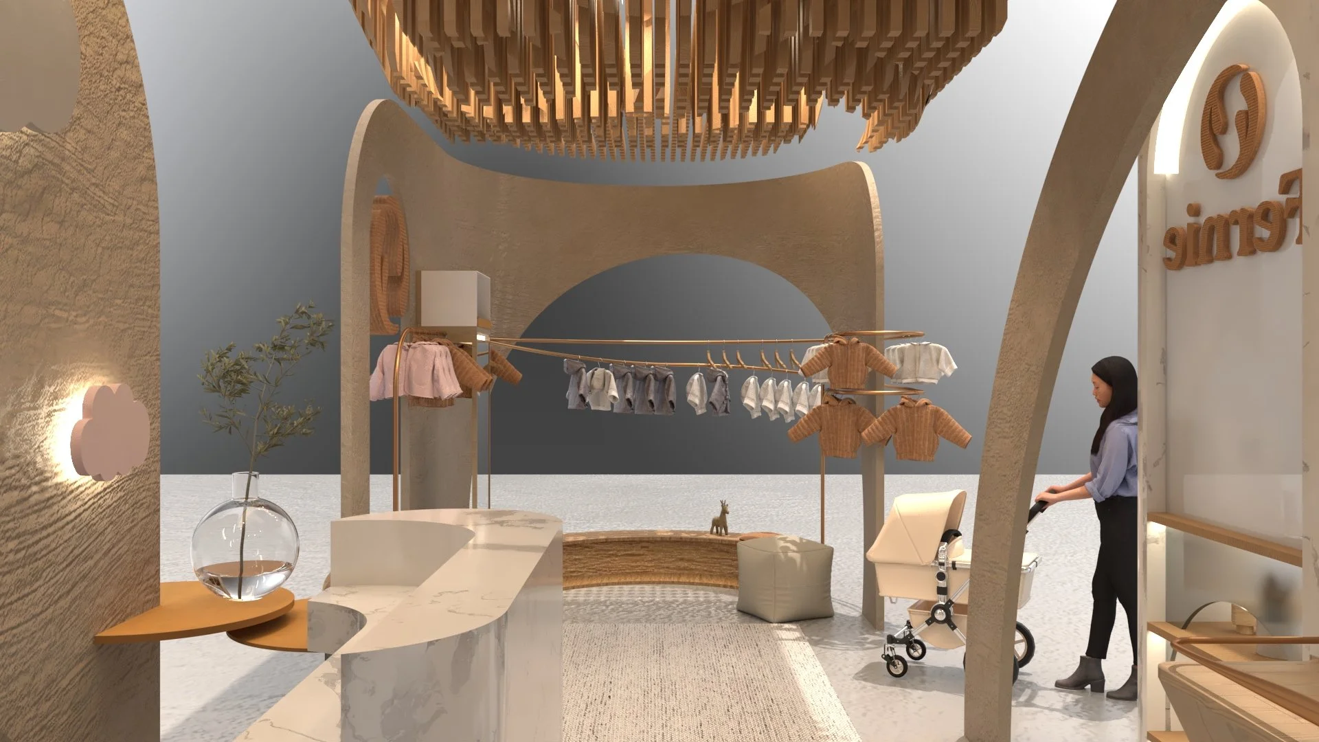 Designed in Rhino 8 and rendered with V-Ray, this tactile trade show booth invites new parents into a warm, sensory-first environment. The spatial design draws inspiration from the Fernie logo’s circular form and layered softness, creating a space where visitors not only shop but feel part of the brand’s world.